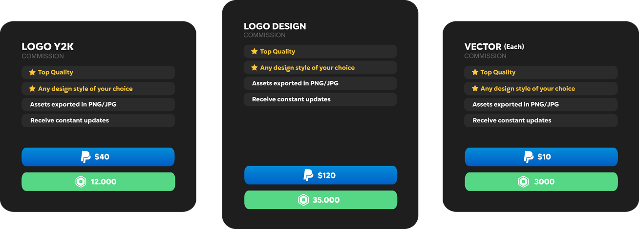 I. To proceed with the creation of the initial sketch, a 50% down payment is required. Once the sketch is completed and approved by the client, the remaining payment will be requested to proceed with the project or before delivering the final files.II. Kindly refrain from rushing the creative process.III. Reselling, redistributing, or sublicensing the logo is strictly prohibited.IV. Significant revisions requested during the logo creation process may incur an additional cost; pricing depends on the scope and complexity of the changes.V. In the event of order cancellation after work has commenced, refunds will not be issued, and any completed work remains the property of the artist.VI. Upon sharing the logo on any social media platforms, inclusion in a portfolio, or integration into a GFX (thumbnail/icon) commission sheet, please provide proper credit to @SakGFX.VII. Please ensure that the logo is used in accordance with its intended purpose and that any alterations or modifications are approved by @SakGFX prior to implementation.VIII. Please inform me of any specific deadlines in advance. For orders requiring expedited delivery due to time constraints, additional charges may apply, depending on the urgency.IX. If you wish to obtain the files containing the logos and concepts created, an additional charge will apply.I do not accept intermediaries in servers to accept payments, payments are only made using Paypal or Robux.While crediting on the Roblox game page or in-game is not mandatory, it is greatly appreciated.